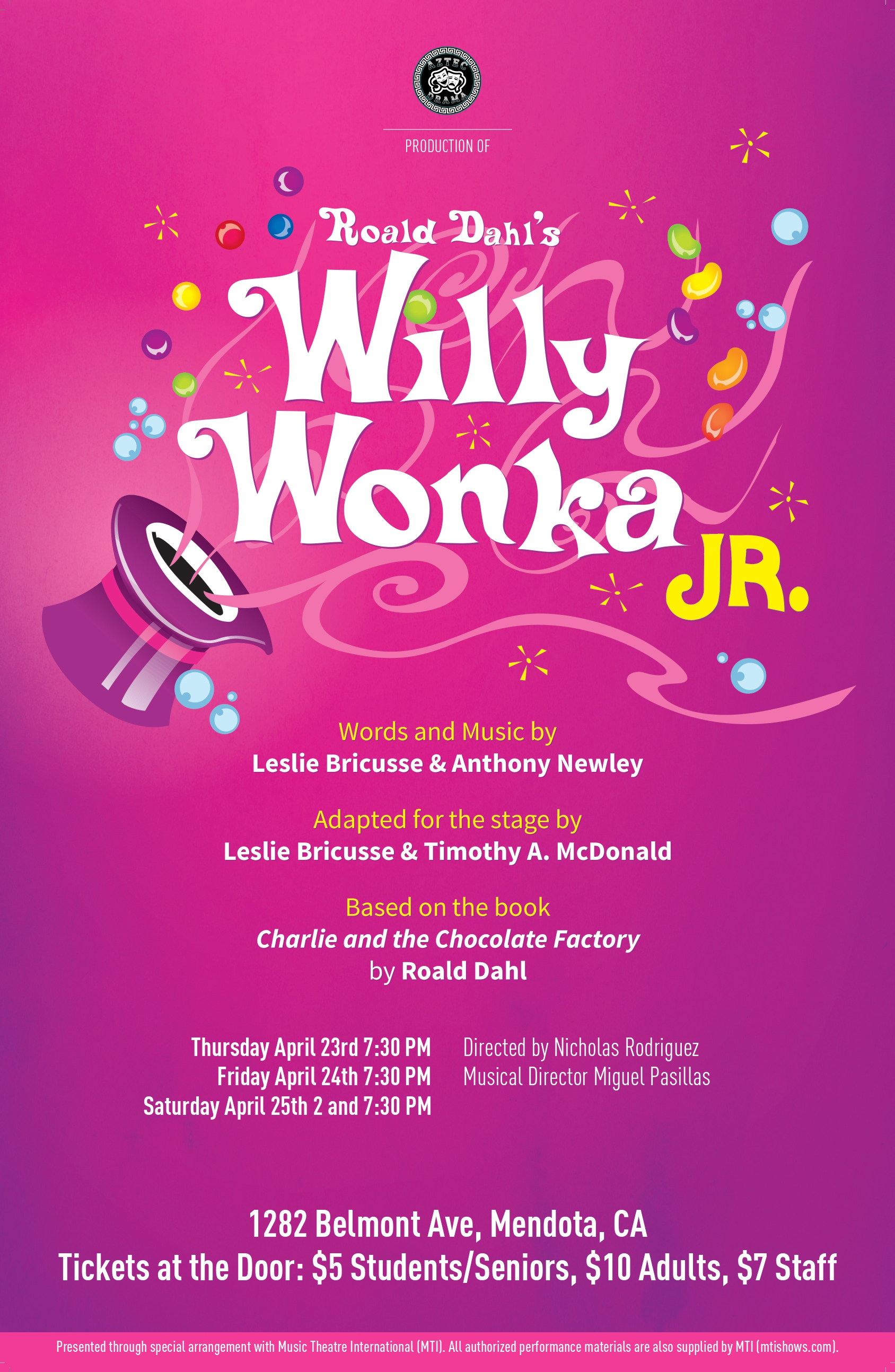 Roald Dahl's Willy Wonka Jr. Join a world of Pure Imagination with Aztec Drama's first musical, Roald Dahl's Willy Wonka Jr. at the Mendota Cafetorium! 1282 Belmont Ave, Mendota, CA Apr 23 - 25, 2026 Mendota Junior High Mendota Unified